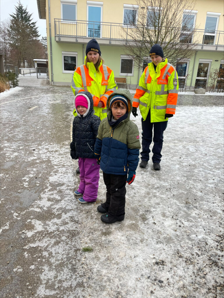 Danach wurde das Überqueren der Straße direkt noch praktisch bei eisigem Regen auf dem Pausenhof geübt.